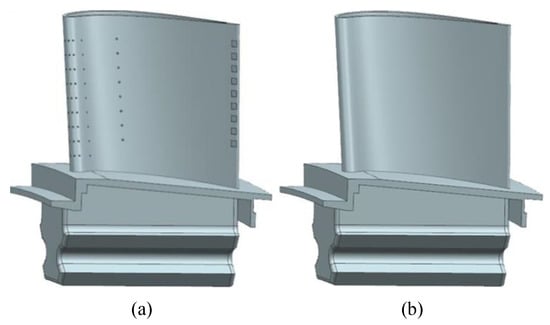 The blade geometric model is cycled to obtain the detailed feature set, such as air film holes, impact holes, tail seams, etc. The detailed features are suppressed. Figure 10 shows the blade models before and after detail features suppression.