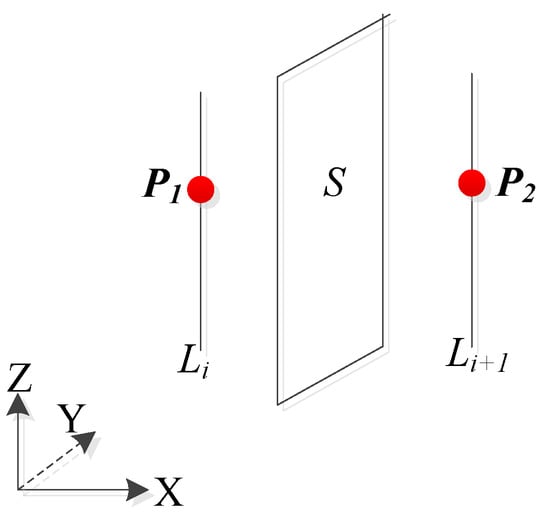 If in is the wall of the flow channel, then there is . When , the points on the skeleton line are all on the left side of the , and when , the points on are on the right side of . Due to the existence of errors and the complexity of discreteness, the efficiency will be affected and the robustness will be poor if all discrete points participate in the above judgment. Therefore, two trisection points are selected for each skeleton line as reference points for judging the skeleton line according to the minimum point judgment criterion, as shown in Figure 12.