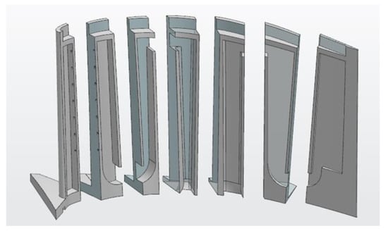 The flow channel of the turbine blade is mainly divided by the spacer ribs to form a plurality of flow cavities. Each flow cavity is connected by a transition section. Therefore, the spacer rib is an important reference for the longitudinal flow channel division of the turbine blade. The division reference planes are formed using the middle surface of the spacer rib and the two sides of the existing spacer rib. For better procedural expression, it is necessary to analyze the characteristics of spacer ribs. Turbine blade spacer ribs are illustrated in Figure 9.