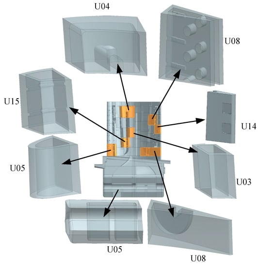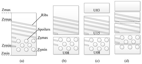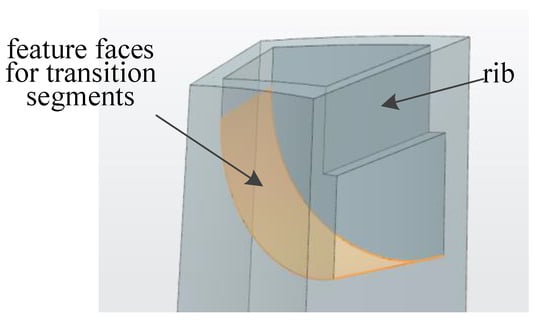 The extraction data related to the geometric structure of each flow unit of the blade should follow the steps of (1) functional domain decomposition, and (2) data redefinition and analysis feature recognition. The following introduces the extraction method of data extraction of the flow unit, taking the geometric unit with the spoiler rib shown in Figure 26 as an example.