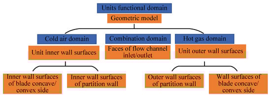 Based on the analysis principle of pipe-network calculation and the classification and definition of analysis parameters, the functional domain of the air-cooled blade is analyzed. The functional domain can be divided into the hot gas domain (extract the relevant temperature parameters such as the heat exchange area on the gas side), the cold air domain (calculate the parameters such as the cold air pressure and flow rate), and the combination domain of the two. The geometric structure corresponding to each sub-functional domain has obvious boundaries, so the blade geometric unit can be decomposed into geometric domains based on the functional domain decomposition. Each analysis parameter can be mapped to each sub-geometric domain. The domain decomposition logic of the main components/units of the air-cooled blade air system is shown in Figure 28.