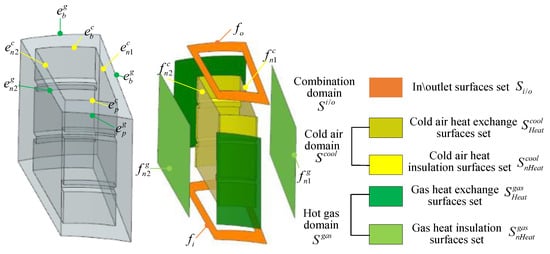 For the blade element with spoiler rib , according to the above domain decomposition logic, it can be divided into the cold air domain, the gas domain, and the combined domain. An adjacency diagram is constructed for the unit , from which the nodes at the inlet and outlet surfaces of the flow cavity are identified, that is, the adjacency diagram of the element is automatically divided into subgraphs representing the gas domain surface ring, and the cold gas domain flow cavity surface ring, respectively, using the subgraph decomposition method. After domain decomposition of this type of unit, the color is used to represent the face elements contained in each sub-geometric domain. The results are shown in Figure 29, in which a large number of fillet features are suppressed for the convenience of display. At the same time, since the blade longitudinal rib is assumed to be adiabatic in the pipe-networks calculation, the geometric elements of the cold air region and the gas region can be logically further divided into heat exchange surface set and thermal insulation surface set for later description.