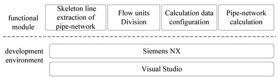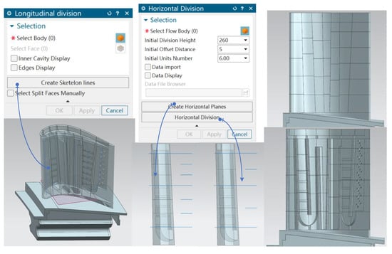 A software system has been developed for calculating data extraction and configuration of turbine blade pipe-network calculation. It mainly includes two modules, the bottom development environment module, and the functional module, as shown in Figure 30. Siemens NX is the geometric algorithm library, which is used as the blade CAD model reading, flow units adaptive segmentation, and flow unit data calculation. Visual Studio is the interface layer, which is used to draw the network diagram, and to configure the data of the flow unit. Figure 31 and Figure 32 show the automatic extraction, optimization, and adaptive segmentation interfaces of turbine blade flow path skeleton lines. Figure 33 shows the drawing of the pipe network diagram and node data configuration.