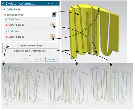(1) A skeleton line extraction method based on the principle of imitation fluid flow is proposed, which can automatically generate and iteratively optimize the flow path skeleton line. By simulating the characteristics of airflow, this method realizes the self-adaptive division of flow units and the automatic judgment of the connectivity of flow units based on the skeleton line calculation without the assistance of manual interaction and the identification of complex geometric feature units.