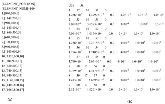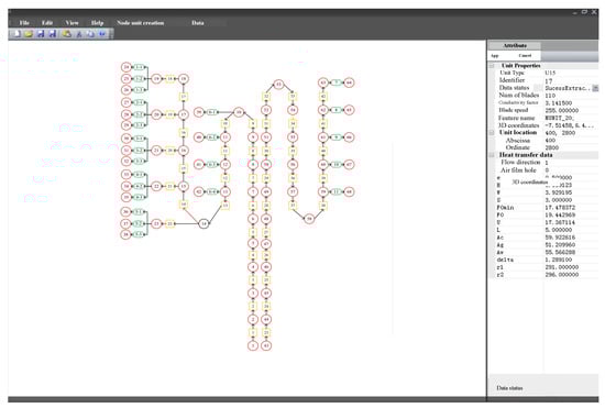 A dual-channel rotor blade with a complex cooling structure is designed, and its modeling and simulation process is introduced. First, the blade structure design is completed based on the blade parametric design system, including the blade body, tail seam, spacer rib, spoiler rib, spoiler column, root extension, tenon, flange plate, impact hole, air film hole, etc. The blade geometric model is shown in Figure 34a. The blade is quickly decomposed into geometric units with specific cooling characteristics by using an adaptive division method based on skeleton lines, as shown in Figure 34b. According to pipe-network requirements, each unit is abstracted as a component, the topological connectivity between the units is calculated, and the physical attribute data are extracted. By importing the above-extracted data into the network diagram platform, the data of elements, nodes, topological connectivity, and element attributes can be visualized for verification and correction by designers, as shown in Figure 35. The extracted data are stored in a user-defined format, as shown in Figure 36a. Finally, the analysis data file conforming to the input format of the pipe-network calculation system is exported from the network diagram platform, as shown in Figure 36b. It is directly input into the pipe-network calculation system, which can solve the key parameters of flow and heat at each element and node within a few seconds, and output them in a specific data format for designers to evaluate the rationality of the blade fluid design scheme, and provide necessary boundary data for subsequent temperature field calculation.