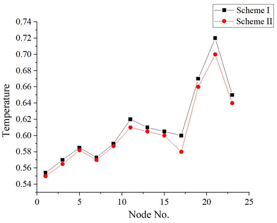 In this case, a new cooling scheme can be generated by modifying the air film hole diameter of the blade shown in Figure 34 and fine-tuning the angle of the rib. Among them, the gas film holes’ diameter is 0.35 mm in the original Scheme I, and the gas film holes’ diameter is modified to 0.55 mm in the newly generated Scheme II. The flow heat design results of the two schemes can be quickly obtained and compared using the presented data extraction method and pipe-network calculation system. Table 5 shows the cold airflow at the inlet and outlet nodes of the two schemes. Figure 37 shows the medium temperature and nodes on a cold air flow path of the blade (left flow path shown in Figure 35). The flow and heat parameters obtained from the pipe-network calculation system are taken as part of the boundary of the temperature field calculation. It can be seen from the comparison of schemes that the cooling effect of Scheme II is better due to the larger pore diameter and larger cooling air consumption.