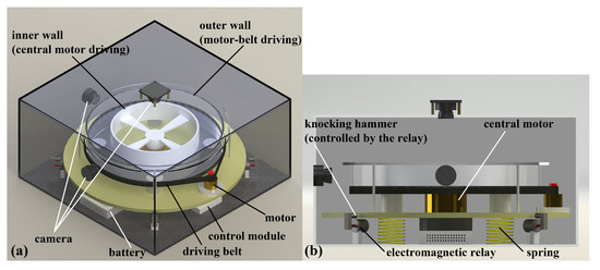 Design scheme of the apparatus of experiments on sheared granular matter in a space station. The movement of particles is designed in the annular region between the inner and outer walls. The driving mechanism of shearing walls and the knocking mechanism for expelling particles attaching to the walls are depicted. Panel (a,b) are from different perspectives.