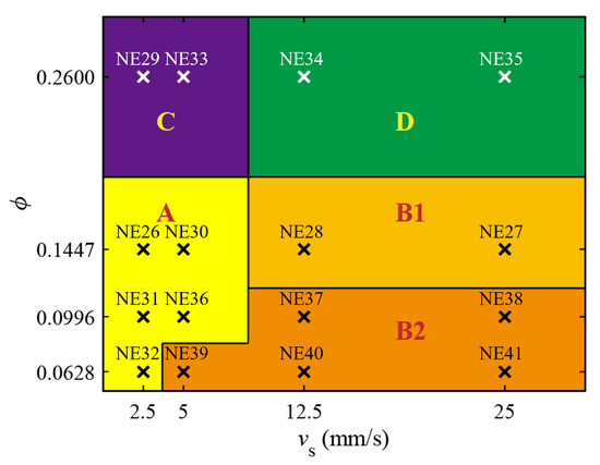 Classification of evolutionary paths in the parameter space spanned by the shear velocity and the filling factor . Different context colors and letters (A–D) indicate different evolutionary paths of particle collisions. × and the label “NEXX” denote the parameter combination where the numerical experiments are performed. For simulations in this atlas, the interparticle cohesive strength c is 4 Pa.