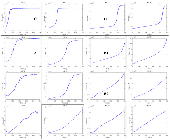 Kinetic energy curves. The panels show the total kinetic energy of particles varying with time in the 16 sets of simulations, which are divided into different evolutionary paths (labeled by black letters) in terms of the curve morphology.