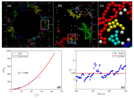 Fractal characteristics in simulation NE31. Panel (a–c) present the agglomerate division at 165 s. Panel (b,c) show the local zoom of the area in the white box in panel (a,b), respectively. Particles are rendered as spheres scaled in terms of particle size and in different colors to distinguish different aggregates. Panel (d) illustrates the mass–size distribution at 165 s and the fitted results of . Panel (e) denotes the fluctuation and average value of during 100∼250 s in the simulation.