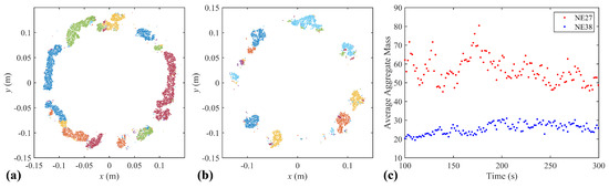 Characteristics of agglomerates at the stage of growth stalling. Panel (a,b) depict the aggregates (particle number ≥ 2) between the inner and outer walls at 250 s in the simulation NE27 and NE38, respectively. Particles attaching to the walls and monomer particles in the annular gap are omitted. Points in different colors only represent particle positions, not scaling with particle radius. Panel (c) presents the tendency of the average mass of aggregates with time.