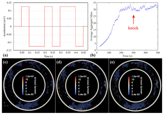 Based on the numerical experiments shown above, the outcome that particles or aggregates attach to the walls is unavoidable, mainly owing to the centrifugal effect. The phenomena render the shear action inefficient. Therefore, we design four knocking hammers in the apparatus scheme to expel the particles by impulsive loads. Here, we simulate the knocking–expelling mechanism by applying an acceleration impulse on the walls. The acceleration pattern set on the walls in a single direction (such as the x-axis direction) is shown in Figure 8a. The acceleration impulse is applied in two perpendicular directions. As for the timing of impulsive loads, when the collision and growth process steps into a steady state, such as the plateau stage of the evolution of the average mass of aggregates as shown in Figure 8b, apply the knocking loads. The aim is to cause the particles and aggregates to regain the velocity in the radial direction and initiate new collisions and growth. Figure 8c–e exhibit the effect of impulsive loads acting on the walls: particles and aggregates depart the walls and remix in the annular gap.