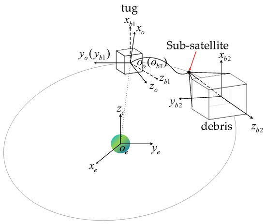 The two-segment tether towing system studied in this paper is shown in Figure 1. The system consists of a tug, a sub-satellite, a piece of space debris, and two segments of elastic tethers. The sub-satellite is released by the tug, and the second segment tethers are released by the sub-satellite to capture the space debris. Both the tug and the debris are regarded as rigid bodies. The sub-satellite, whose size is small compared to the length of the tether, can be regarded as a particle. The two parts of the tethers are regarded as massless spring-damper systems and can only be tensioned. The first part is released by the tug. The second part, which is attached to the ends of the debris, is released by the sub-satellite. To describe the kinematic relations of the components accurately, three right-handed frames are introduced. The orbit frame has its origin located at the mass center of the tug. The -axis points away from the Earth’s center to , the -axis is the flight direction of the tug, and the -axis conforms to the right-handed rule. The tug body frame and the debris body frame are placed at the mass centers of the tug and debris, respectively, whose axes are aligned with the principal moments of inertia axes of the two bodies.
