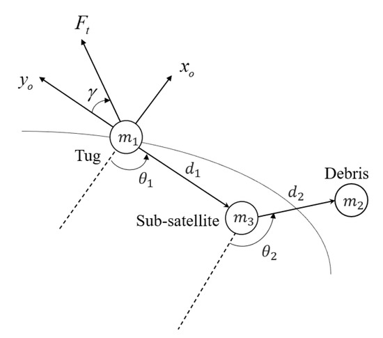 Figure 2 shows the simplified system schematic diagram. is the distance between the tug and the sub-satellite. is the distance between the sub-satellite and the debris. is the in-plane angle between the first-part tether and the negative direction of the -axis. is the in-plane angle between the equivalent tether and the negative direction of the -axis. is the thrust of the tug. is the angle between the thrust and the -axis.