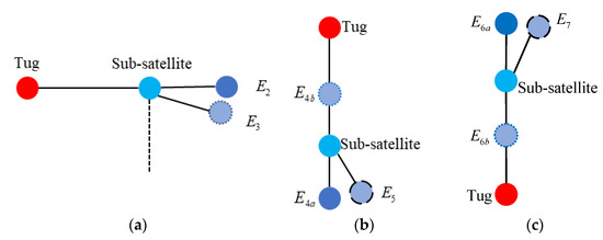 Figure 3 gives the schematic diagrams of the solutions shown in Equation (23). The red ball represents the tug, the light blue ball represents the sub-satellite, and the other balls correspond to the debris in each configuration.