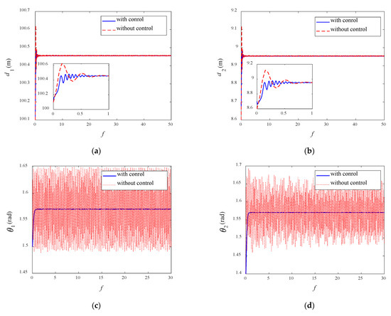 Variations of the generalized coordinates with and without control: (a) ; (b) ; (c) ; (d) .