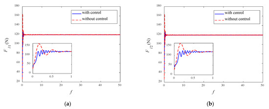 Variations of the tether tensions with and without control: (a) ; (b) .