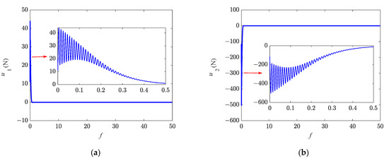 Figure 8 shows the variations of the sliding mode surfaces. Figure 9 shows the variations of the control forces and . When and approach zero, and reach the desired state and the air jets stop working. It can be seen from Figure 9 that is positive and changes along the -axis of the orbit frame while varies in the negative direction of the -axis. To satisfy this control requirement and guarantee the desired performance, the tug and the sub-satellite are required to provide two opposing control torques to force the in-plane libration angles to the desired state.