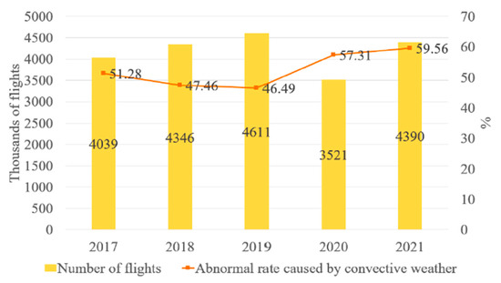 In the Chinese air transportation system, flight irregularity rate caused by weather has been high [1] (see Figure 1) with the rapid growth in air traffic in recent years, and weather tops the list of all factors causing flight delays. Weather-related irregularities accounted for 59.56% and 66.5% of the total irregular flights in China [1] and the United States [2], respectively. This figure was also as high as 41.9% in the Europe [3]. To try to mitigate these delays and reduce the impact of convective weather on the air transportation system, airspace capacity should be effectively and accurately evaluated. It could ensure a balance between demand and capacity on the impacted resources. Tactical air traffic control would effectively handle flight demand with minimal airborne holding, deviation, and re-routing.