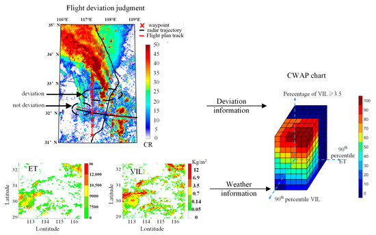 CWAP is the probability that an aircraft avoids convective weather with a certain severity, which is obtained by calculating the ratio of historical diversion flights to the total number of flights under the corresponding weather conditions. The calculation process is shown in Figure 2. As shown in the upper left figure, the red line represents the flight plan, and the black line represents the radar track. An east–west flight did not affect by convective weather, and the radar track followed the flight plan. However, a south–north flight encountered solid convective weather, which caused it to divert from 31° N to 35° N. The information of whether each flight is diverted or not is counted. At this time, the weather conditions expressed by 90th percentile ET, 90th percentile VIL, and percentage of VIL ≥ 3.5 were also recorded, as shown in the lower left figure. Finally, the CWAP chart is obtained by smoothing, as shown in the right figure. This is a three-dimensional coordinate, representing the above three meteorological indicators, respectively. Each point in the figure represents the probability of flight diversion under the corresponding weather conditions. Different colors from cold to warm represent the probability of flight diversion from small (0) to large (100%), as shown in the color bar.