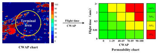 According to the weather data of the historical flights, the flight diversion information, and the permeability calculation principle of Section 3, the CWAP and the permeability charts of Guangzhou terminal area and Wuhan terminal area are calculated and shown in Figure 8.
