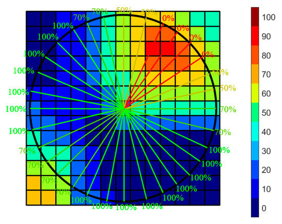 As shown in Figure 4, the permeability calculation in each historical period in practice is as follows. After obtaining the CWAP figure, a notional route from the center point to the boundary of the terminal area is drawn at a 1° interval. According to the permeability chart in Figure 3, the permeability of the 360 notional routes at each 6 min interval (weather data update time) is obtained. The color bar is the legend of CWAP, and the number is the permeability of the notional route. Finally, the permeability Pj of 360 notional routes in a certain period (one hour) is obtained by averaging the 10 permeability , as shown in Equation (1):