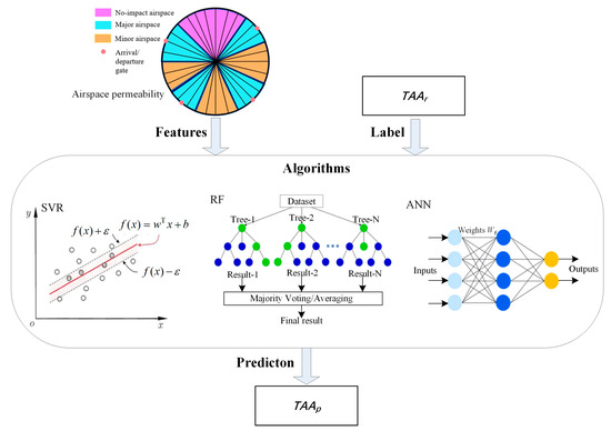 For ease of understanding, Figure 5 is a concise diagram of the workflow of this mod-el. The availability rate prediction is realized by three machine learning algorithms, SVR, RF, and ANN, in this paper. The permeability of different types is divided into features, and the actual availability rates in the corresponding period are presented as labels. After training the internal parameters according to the calculation guidelines of different algorithms, the predicted availability rate can be obtained under convective weather. In Figure 5, TAAp is the prediction of the terminal airspace availability rate under convective weather, and TAAr is the actual terminal airspace availability rate.