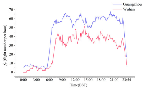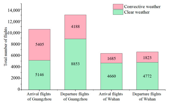 As shown in Figure 7, Guangzhou terminal area and Wuhan terminal area have fewer flights from 24:00 Beijing Standard Time (BST) to 07:00 BST the next day. Therefore, the periods from 08:00 to 23:00 BST from 3 to 31 August 2018 are selected for the case study in this paper. There are a total of 4640 valuable slots. After filtering, the number of slots meeting convective weather in Guangzhou terminal area and Wuhan terminal area are 660 and 1357, respectively.