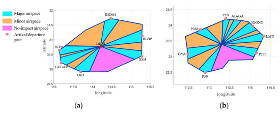 According to Section 4.1.1, the major airspace, minor airspace and no-impact airspace of Guangzhou terminal area and Wuhan terminal area are determined, respectively, based on their arrival gates and departure gates and historical traffic flow distribution, as shown in Figure 9. The number of major airspaces in the Guangzhou terminal area and Wuhan terminal area is 8 and 6, respectively, so 9 and 7 input features are obtained.
