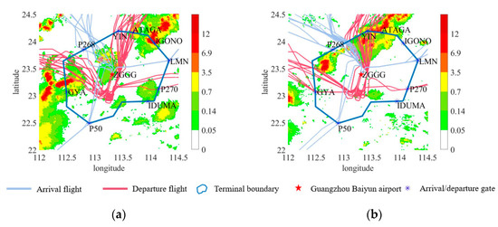Overlay graph of radar tracks and weather information in Guangzhou terminal area. (a) 14 August 2018, 19:00–20:00 (BST); (b) 14 August 2018, 20:00–21:00 (BST).