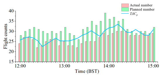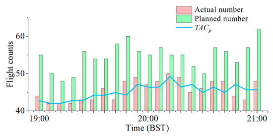 In Figure 12, the green bar represents the planned flight amount, the pink represents TACr, and the blue curve presents the TACp based on CWTAC model. From 19:00 to 21:00, the TACr is much smaller than the number of planned flights due to the convective weather. As the convective weather gradually moves to the west and gradually weakens, the TACr shows a slow upward trend. The CWTAC model captures the impact of the convective weather on the airspace capacity, and the TACp matches the changes in TACr very well. From 19:00 to 19:30, there was severe convective weather near the arrival gates GYA and ATAGA, and the departure gate IGONO, which seriously affected the flight operation of the terminal area. The TACr and TACp are below 45 at this time. After that, until about 20:12, the convective weather continues to move westwards and slightly northwards. The convective weather north of the terminal area exists between the arrival gate ATAGA and the departure gate YIN. Thus, the TACr and the TACp rise slowly to nearly 50 flights. Thereafter, until 21:00, the weather condition around the arrival gate GYA has been stabilized. The departure gate YIN is affected by convective weather, but due to its own low number of flights, the TACr varies between 45~50 during this period. The TACp remains around 45, with hardly any major changes due to the convective weather, only a slight rise or fall. The actual and TACp are synchronized, and the difference is slight. There may be several reasons, as follows. Firstly, the TACr is affected not only by convective weather in the designated terminal area but also by adverse weather in the surrounding airspace and even beyond. However, the TACp is calculated based on the weather information in the terminal area, and it also tends to be stable when the change in convective weather is small. Secondly, the TACr may increase due to the backlog in the previous time or decrease due to other reasons, such as take-off delays at other airports. It does not take into account TACp. Thirdly, modelling the CWTAC adopts historical flight data. While the amount of data is not large enough, the situation covered is not complete enough, and the data itself has certain uncertainty. The TACp would have a certain error. Fourthly, the control habits of controllers and flight preferences of pilots also have a small impact on the number of real-time flights.