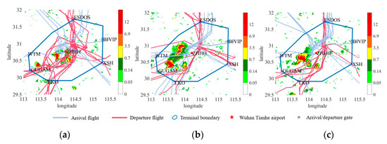 Overlay graph of flight radar trajectories with weather information for Wuhan terminal area. (a)12:00–13:00 (BST); (b) 13:00–14:00 (BST); (c) 14:00–15:00 (BST).