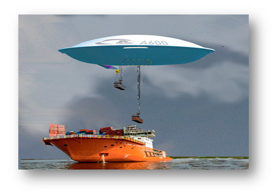 Large capacity airships (LCAs) bring new perspectives for airships that hibernated for more than half a century after the Hindenburg drama. In fact, for more than two decades, researchers have studied the formidable potential of airships in terms of freight transport. These airships will be able to transport blades of wind turbines or logs from or to areas very difficult to access, load or unload container ships on the high seas in the absence of adequate ports (as seen in Figure 1), and install field hospitals in disaster areas. Other examples of the use of airships in land and maritime multimodal logistics can be found in [1,2]. These various examples prove, if necessary, the enormous potential available to these flying machines. However, we should mention that in order to be able to lift 1 kg of load, 1 m3 of Helium must be provided within the hull of the airship. The airships targeted for the aforementioned examples will therefore have enormous volumes, and all the obstacles inherent in these large volumes have not yet been overcome. Among these obstacles, we note on the one hand, the high sensitivity of airships to gusts of wind. Various studies have looked into the stabilization of airships, particularly in hovering flight or for tracking trajectories (see, for example, [3,4,5,6,7]). On the other hand, the non-standard dimensions of these devices make the development of landing or handling areas very problematic or costly. This has left the designers of these machines to consider handling operations at altitude. It is in this context that our study takes place. We propose for this task a smart crane capable not only of loading and unloading but also of stabilizing the load during a gust of wind and of arranging the hold of the airship. This crane will be based on a cable-driven parallel manipulator (CDPM).