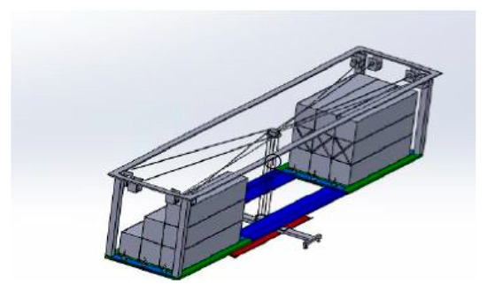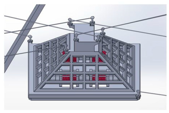The smart crane called CHAYA-SC is presented in Figure 2. It consists of a cuboid trunk (that we could see in details in Figure 3) supported by eight cables suspended from the four upper corners of the airship hold. These eight cables are arranged to kinematically constrain the trunk.