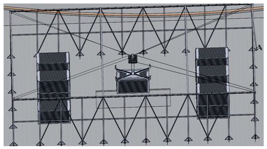 The CDPM is suspended by eight cables for six DOFs. The cables are connected on the other side to the hold of the airship at the top of the pillars (as seen in Figure 7). Each point of attachment of the cables is therefore directly deduced from the motion of the center of gravity G of the airship.