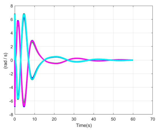 Figure 15 and Figure 16 show the angular accelerations and speeds of the motorized pulleys which drive the cuboid. With the movement of the latter being rectilinear along axis , it is noted that the accelerations of the “front” pulleys (colored in blue) are identical and opposite to those placed at the rear of the cuboid (colored in magenta).