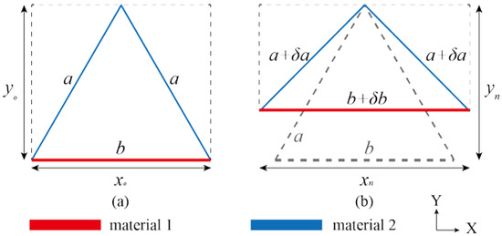 It is known that the triangle configuration is the simplest hinged structure that is free to deform upon temperature change [34,35]. An isosceles triangle structure is considered here. Two equal-length beams are constituted with one material and the base beam is constituted with another material. The shape before and after heat transformation are shown in Figure 1.