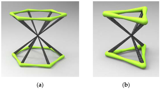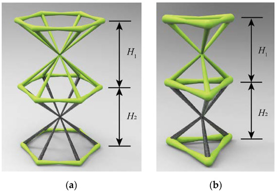 Two basic configurations are proposed to seek the ZTE design. They are the hexagonal hourglass type and the triangle hourglass type. The schematic illustration of two types of single layer hourglass unit cells is shown in Figure 2. It is composed of two materials. The top and bottom braces are chosen to be nylon, and the hypotenuses are CFRP-nylon in this analysis [15]. The mechanical and thermal properties of the two different materials are listed in Table 1. Under the background of in-space fabrication, the length of braces is set as L = 6 m, and that of the hypotenuses vary with the height.