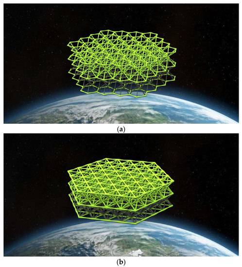 The large-scale space lattice structure is constructed by the way of arranging the dual-layer unit cells into a circular array. The array number N represents the number of circular layers of the unit cells that are around the centered unit cell (N = 0). The circular array method is shown schematically in Figure 4. This type of configuration is widely used in the design of space telescopes and antennas, such as the James Webb space telescope [39]. The lattice structures in various array conditions have all satisfied the rule of the circumferentially dense accumulation. The beams are connected to a whole through the coincident nodes from each other. Two types of circular array are shown in Figure 5. All the beams in the dual construction have a tunable section radius, which is the sensitive parameter for optimizing the ZTE design.