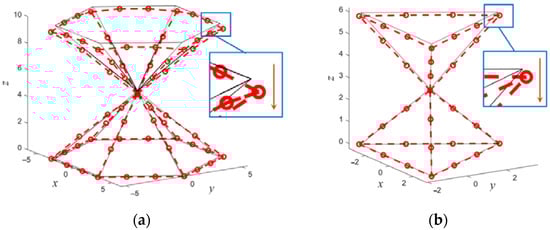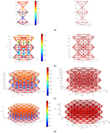 In this section, several numerical examples are conducted to evaluate the performance of NTE in the thickness direction by the structural optimization method with the gradient-based algorithm. The initial temperature is set as T0 = 273.15 K, and then a temperature change of ∆T = T1 − T0 = 100 K is applied to the whole model. To calculate the free expansion in the thickness direction during the temperature change, the horizontal displacement freedom is constrained at the bottom. Each beam is divided into three elements, and the radius of the beam element is set as the variable in the optimization algorithm. The radius change range is 0.05 m ≤ ri ≤ 0.2 m. As depicted in Figure 7, the NTE performance of the unit cell is achieved by the optimization algorithm. The NTE of final optimized lattices in the thickness direction are −8.586 × 10−5 m/(m·K) for that of the hexagonal type and −5.576 × 10−5 m/(m·K) for that of the triangular type.