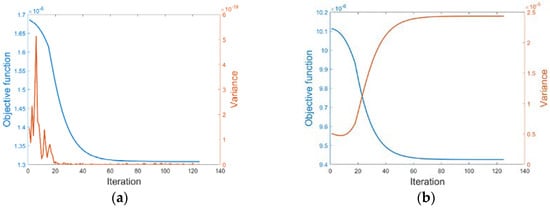 Convergence curve of the objective function and variance constraint of the (a) hexagonal type; and (b) triangular type.