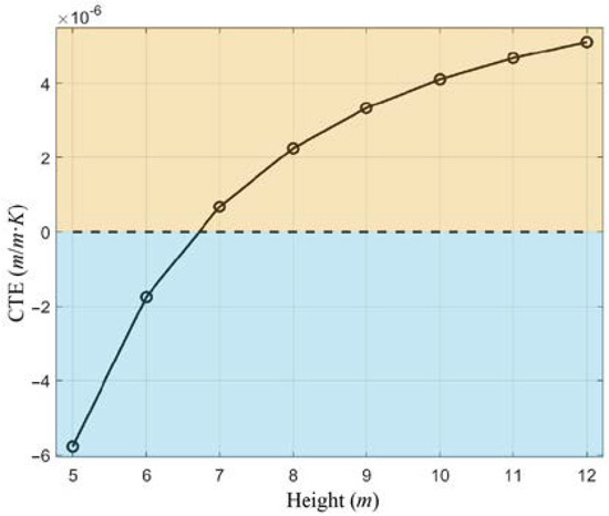 The height of the unit cells is an obviously critical geometry parameter during the ZTE design. In order to intuitively sketch the influence, the simplest model of a triangle with all DOF constraints at the top node is studied, which is shown in Figure 1. The CFRP-nylon and nylon mentioned in Table 1 are given to the hypotenuse and the brace, respectively. The height of the triangle can be solved by the Pythagorean theorem. Consequently, according to Equation (5), the CTE curve with respect to the geometry height is illustrated in Figure 11. It is obvious that the height parameter can lead PTE and NTE attributes in different values. Based on this finding, the design space of a near-ZTE structure can be found.
