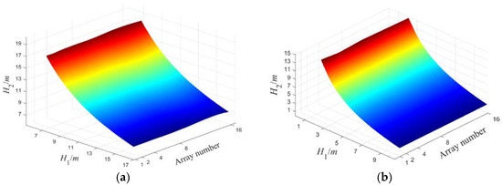 Using the structural optimization method, the PTE lattice height H1 and NTE lattice height H2 are adjusted, as shown in Figure 3, at the reasonable boundaries to calculate the effective thermal displacement in the thickness direction. As shown in Figure 12, the thermal displacement in the thickness direction with variable height parameters is drawn. When a ZTE plane is inserted into the plot, a ZTE curve can be obtained by corresponding to different height parameters, as depicted in Figure 13. Table 3 lists several height-dominated optimization results with the different height ratios. Compared to Table 2, the effective CTE is further reduced to the order of about 10−9 by considering the optimal height ratio.