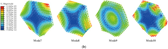 A structure modal analysis is performed under a free boundary condition to obtain the natural frequencies and mode shapes of the metastructure. The FEM procedure is used for the modal analysis. In consideration of the space operation environment, there is no displacement constraint or inertial force applied to it. Next, the Lanczos method is adopted to solve eigenvalues to calculate the natural frequencies [41]. Because of the boundary condition, the first six eigenmodes represent the rigid body motion and are disregarded. The seventh to tenth eigenmodes are shown in Figure 15. The seventh eigenfrequency represents the natural frequency of the structure. Its relation corresponding to the array number is investigated, as shown in Figure 16. It shows that the frequency increases first and then drops as the array number N increases, as depicted in Figure 16a. The natural frequency is a crucial factor for orbit and attitude control [42]. Furthermore, the effective stiffness is plotted in Figure 16b. The effective stiffness is actually calculated by the scaling of . The structural stiffness starts to drop as the circular array layer number N moves beyond 3 and the structure becomes large and flexible.