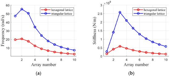 Natural frequency variation with respect to array numbers (a) frequency curve (b) stiffness curve.