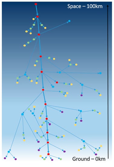 An Extensive Atmospheric Shower (EAS) is the physical phenomenon created by high-energy particles coming from space when they enter the top of atmosphere [2,3]. During their propagation in the atmosphere, these primary particles interact with air molecules and create secondary particles, which themselves continue to interact with the atmosphere, generating new secondaries and creating showers of particles. This process will continue until no more interactions are possible. In Figure 1, a schematic of an EAS is presented, showing the creation of secondary particles from a primary particle.