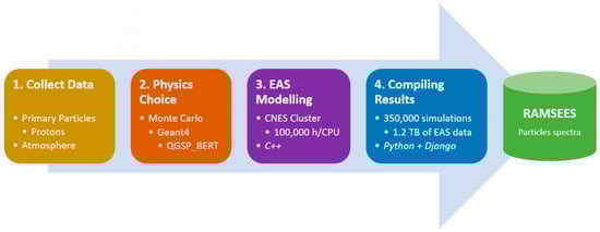 To give the user a tool able to calculate SEE, we divided the work into four steps, presented in Figure 2. The first one is the collection of the information needed to simulate the EAS phenomenon, which are the primary particles—in our case, the protons coming from space—and the atmosphere definition. The second one is the choice of the physics used to simulate the EAS; in our case, the Monte Carlo simulation by Geant4 using the QGSP_BERT physics list. The third one is the EAS modelling itself, representing the geometry and simulating enough time to gather sufficient statistics. We simulated the EAS phenomenon in the CNES (Centre National d’Études Spatiales) Cluster during 100,000 h equivalent on one CPU using our C++ code with the Geant4 toolkit. The fourth one is the compilation of the simulation. We combined all the calculations, i.e., 350,000 simulations, for more than 1.2 TB of data by using Python and the Django framework. Finally, we developed our tool, which includes a database of the EAS interaction in the atmosphere, allowing particle spectra to be estimated for any place on Earth.