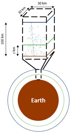 Figure 3 is a schematic of the principle behind our simulation. We simulated showers of particles in a volume of atmosphere of 30 km × 30 km × 100 km. Primary protons are incoming at the top of the atmosphere and their energies are chosen according to Section 3.2.2. For the sake of simplicity, we consider that protons reach the atmosphere with a normal incidence (i.e., vertically). Doing so implies that the flux of primary protons is fully described by the quantity as we integrated over the solid angle. Moreover, the density of the atmosphere varies, as explained in Section 3.1.2. At different altitudes, noted z, we simulated a planar detector to track secondary particles involved in an EAS. Such a detector provides , the differential number of particles i, with energy Ei, which can be created by a primary proton at an altitude z. Then, we can calculate the differential flux of that kind of particle at the altitude of the detector: