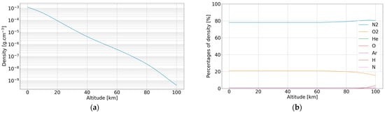 Evolution of the atmospheric composition and density based on MSISE2000 for Paris, France on 21 June 2022: (a) Evolution of the atmosphere density as a function of altitude; (b) Evolution of the constitution of the atmosphere as a function of altitude.