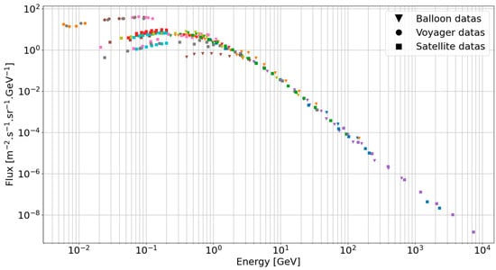 The Cosmic Ray Data Base (CRDB) [32,33] compiles experimental data about cosmic rays measured in atmosphere with balloons, around the Earth from satellites and around the Solar System from Voyager 1 and 2. In the 4.0 version, the CRDB compiles the results of 116 experiments. Therefore, we chose it as the reference for our primary spectrum. Figure 7 presents a compilation of spectrum data from the CRDB. We observe a dispersion of the fluxes below 10 GeV because the lower energetic particles (<10 GeV) interact more with the heliosphere, the magnetosphere, the atmosphere and even the vehicle itself. Therefore, depending on the location (and the presence of an atmosphere or not) and the solar modulation [34,35], the particle flux obviously varies. Above 10 GeV, data are very similar whatever the measurement system, since the particles are too energetic to be affected enough to change the results.